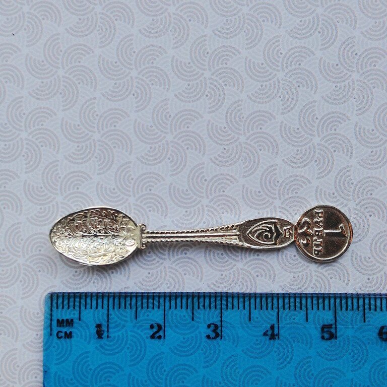 Всю поверхность ложки покрывает красивый ажурный рисунок, а верхняя часть украшена круглым элементом в виде рублевой монеты.